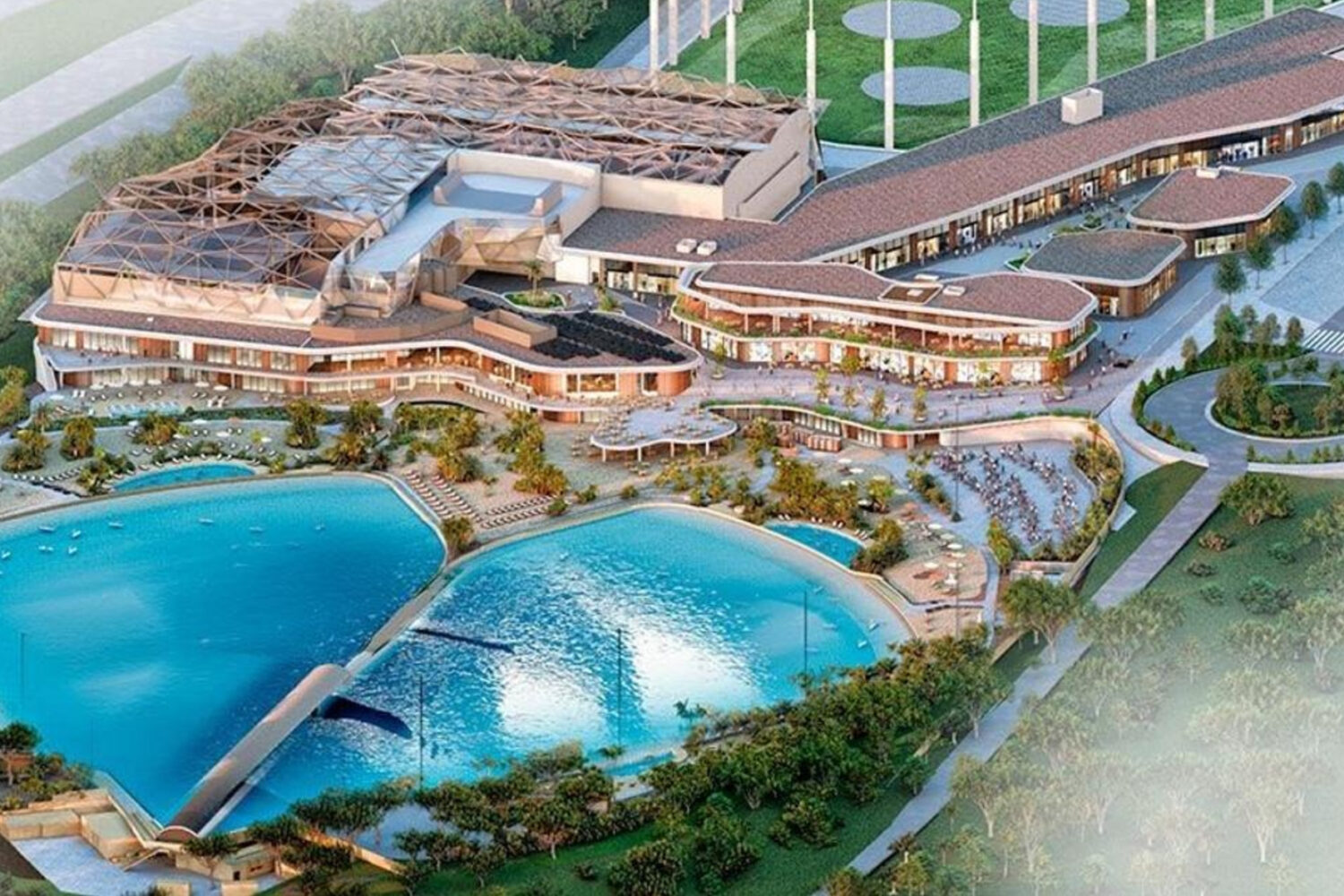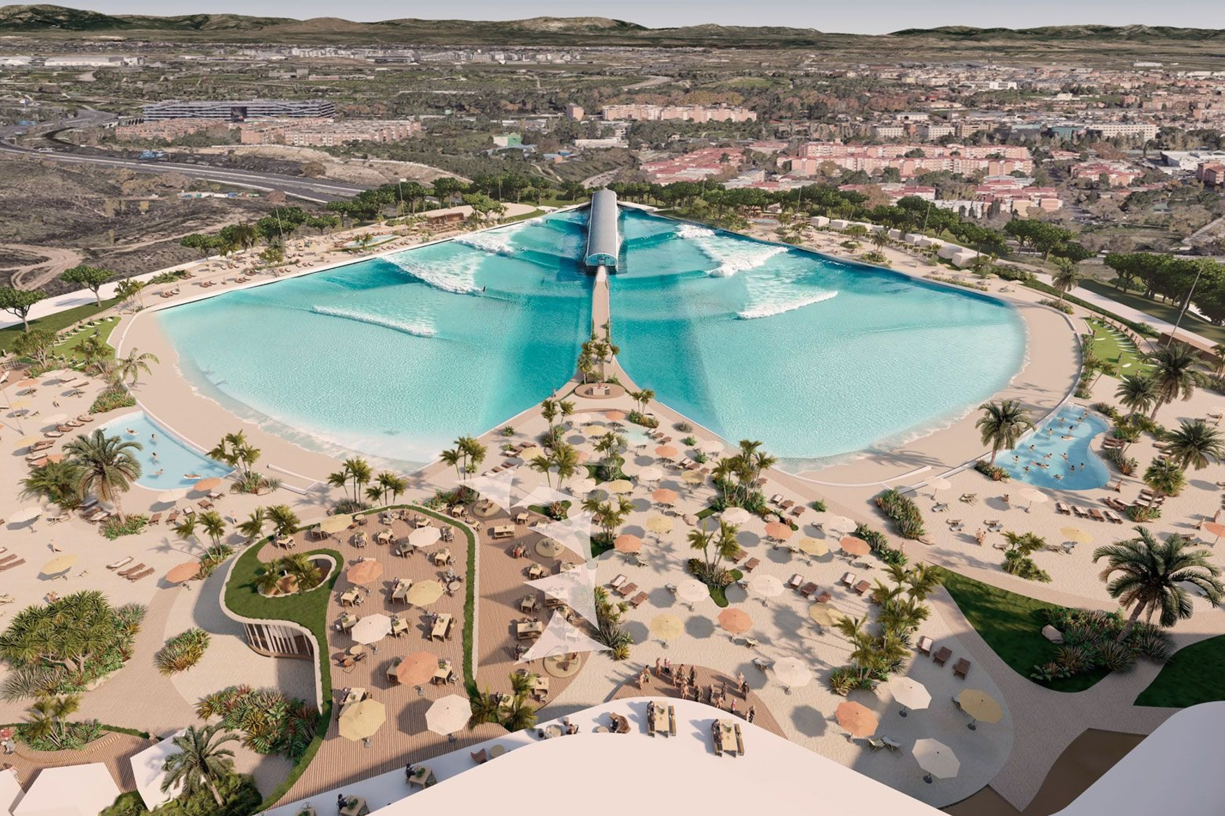 El corazón del complejo será una laguna artificial de unos 23.000 metros cuadrados, equipada con tecnología capaz de generar más de 20 tipos de olas diferentes, adaptadas a distintos niveles, desde principiantes hasta surfistas avanzados.